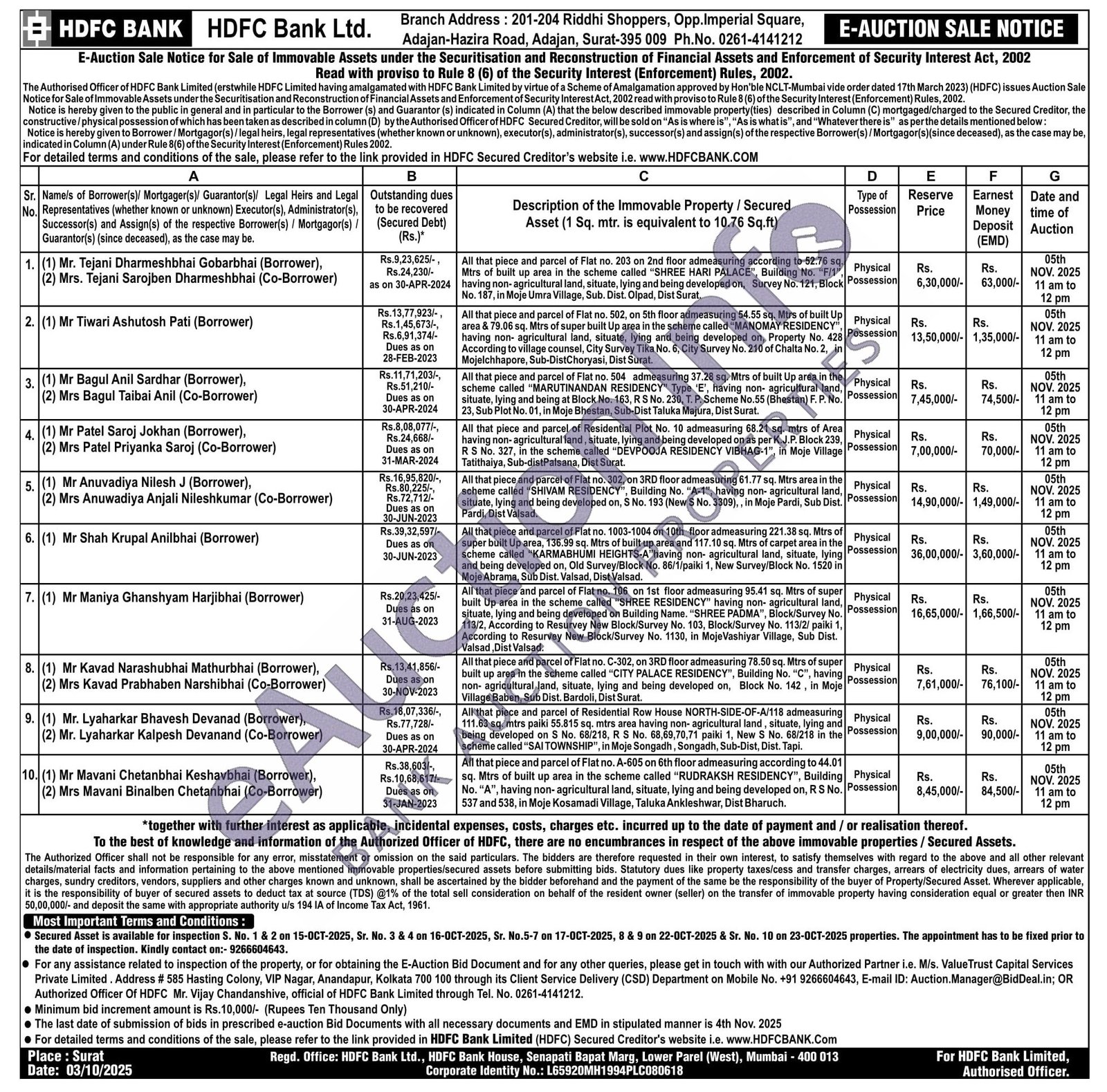 All that piece and parcel of Flat no. 502, on 5th floor admeasuring 54.55 sq. Mtrs of built Up area & 79.06 sq. Mtrs of super built Up area in the scheme called "MANOMAY RESIDENCY", having non- agricultural land, situate, lying and being developed on, Property No. 428 According to village counsel, City Survey Tika No. 6, City Survey No. 210 of Chalta No. 2, in Mojelchhapore, Sub-DistChoryasi, Dist Surat.