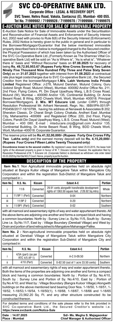 Item No.1: Non Agricultural immovable properties held on absolute right situated at Bangra Kullor village of Mangalore Taluk within Mangalore City Corporation and within the registration Sub-District of Mangalore Taluk and comprised in:- Item No. R.S. No. Kissam Extent A-C Portion 11/6 Converted 29.91 cents alongwith transferable development rights of 1363.50 square feet (126.92 Sq.mtrs) Whole 11/9P 1 (Part) Converted 0-04 Northem 0-20 Northem 0-02 Southem 11/9P 2 Converted Iv 11/9P1 (Part) Converted with all mamool and easementary rights of way and water appurtenant thereto. All the above items are adjoining one another and forms a compact block and having a common boundaries: North by: Survey Line i.e. Sy.No.11/5, South by: Survey Line i.e. Sy.No. 11/7, East by: Village Boundary (Derebail Village) and West by: Drain and portion of land relinquished to Mangalore Mahanagar Palike. Item No. 2: Non-agricultural immovable properties held on absolute right situated at Derebail Village of Mangalore Taluk within Mangalore City Corporation and within the registration Sub-District of Mangalore City and comprised in: Item No. R.S. No. Kissam 4/5A (part) (as per RTC 4/5 AP 1) Converted 4/10 (Part) Extent A-C A-C 0-09.50 Portion Northern Converted 0-82.50 (out of 1 acre 33.50 cents) Southern with all mamool and easementary rights of way and water appurtenant thereto. Both the items of the properties are adjoining one another and forms a compact block and having a common boundaries: North by Portion of Sy. No.4/10, South by Survey Line and Portion of Sy. No.4/10, East by Portion of Sy.No.4/10; and West by: Village Boundary (Bangra Kuloor Village) Alongwith buildings on the above mentioned land bearing Door Nos. 1-18/50, 1-18/51, 1-18/52, 1-18/53,1-18/54, 1-18/50(1), 1-18/68, 1-18/67, 1-18/66 and 1-18/65 measuring 23,562.20 Sq. FL and any other structure constructed to be constructed thereon.