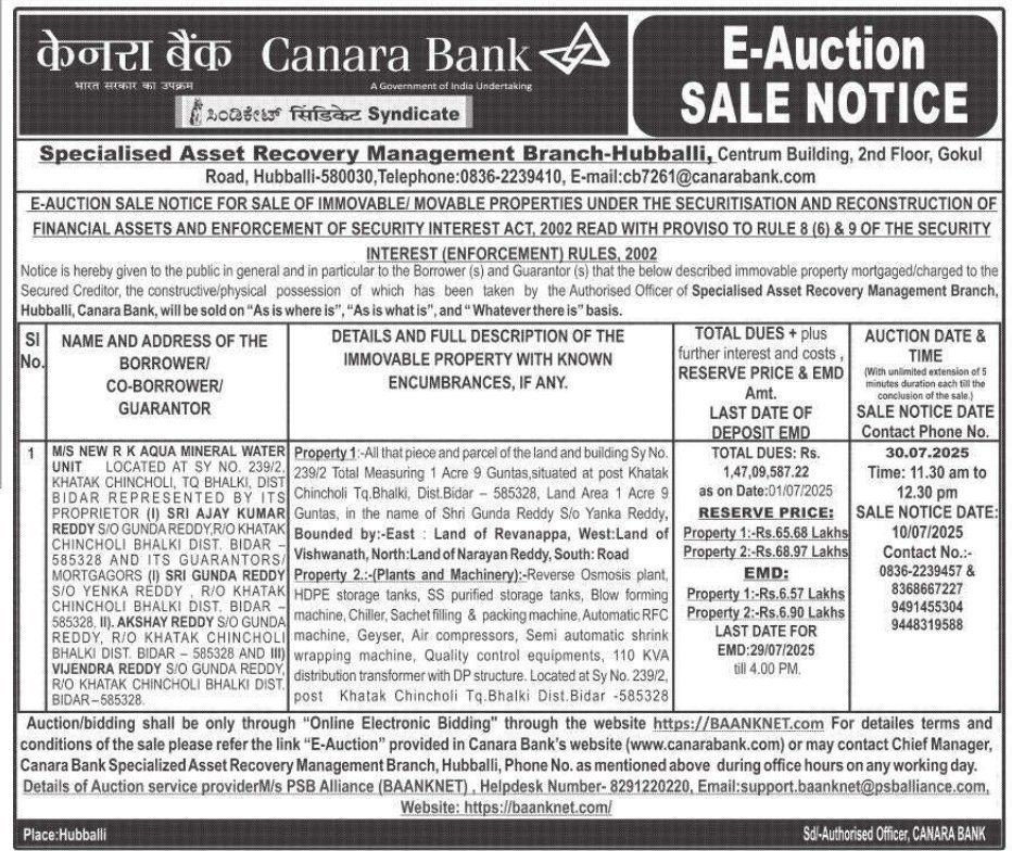 Property 2.:-(Plants and Machinery):-Reverse Osmosis plant, HDPE storage tanks, SS purified storage tanks, Blow forming machine, Chiller, Sachet filling & packing machine, Automatic RFC machine, Geyser, Air compressors, Semi automatic shrink wrapping machine, Quality control equipments, 110 KVA distribution transformer with DP structure. Located at Sy No. 239/2, post Khatak Chincholi Tq. Bhalki Dist. Bidar -585328