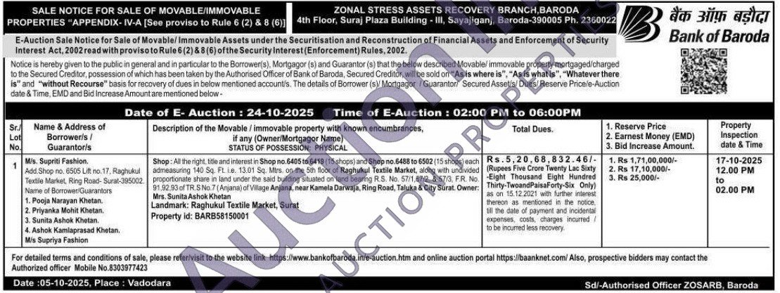 Shop: All the right, title and interest in Shop no.6405 to 6419 (15 shops) and Shop no.6488 to 6502 (15 shops) each admeasuring 140 Sq. FL. ie. 13.01 Sq. Mtrs, on the 5th floor of Raghukul Textile Market, along with undivided proportionate share in land under the said building situated on land bearing R.S. No. 57/1,57/2, & 57/3, F.R. No. 91.92.93 of TR.S No.7 (Anjana) of Village Anjana, near Kamela Darwaja, Ring Road, Taluka & City Surat. Owner: Mrs. Sunita Ashok Khetan