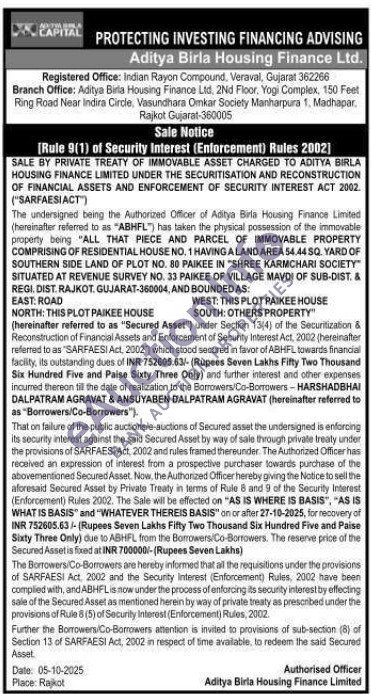 ALL THAT PIECE AND PARCEL OF IMMOVABLE PROPERTY COMPRISING OF RESIDENTIAL HOUSE NO. 1 HAVING A LAND AREA 54.44 SQ. YARD OF SOUTHERN SIDE LAND OF PLOT NO. 80 PAIKEE IN "SHREE KARMCHARI SOCIETY SITUATED AT REVENUE SURVEY NO. 33 PAIKEE OF VILLAGE MAVDI OF SUB-DIST. & REGI. DIST. RAJKOT, GUJARAT-360004, AND BOUNDED AS: