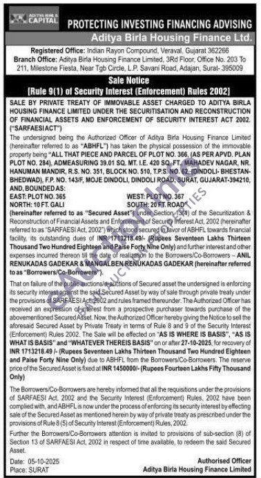 ALL THAT PIECE AND PARCEL OF PLOT NO. 366, (AS PER APVD. PLAN PLOT NO. 284), ADMEASURING 39.01 SQ. MT. I.E. 420 SQ. FT., MAHADEV NAGAR, NR. HANUMAN MANDIR, R.S. NO. 351, BLOCK NO. 510, T.P.S. NO. 62, (DINDOLI-BHESTAN-BHEDWAD), F.P. NO. 143/F, MOJE DINDOLI, DINDOLI ROAD, SURAT, GUJARAT-394210, AND, BOUNDED AS: