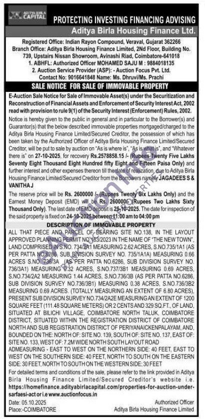 DESCRIPTION OF IMMOVABLE PROPERTY : ALL THAT PIECE AND PARCEL OF BEARING SITE NO.138, IN THE LAYOUT APPROVED PLANNING PERMIT NO. 163/2023 IN THE NAME OF THE NEW TOWN" LAND COMPRISED IN S.NO. 734/2A1 MEASURING 2.62 ACRES, S.NO.735/1A1 (AS PER PATTA NO.6286, SUB DIVISION SURVEY NO. 735/1A1A) MEASURING 0.66 ACRES S.NO. 736/3A (AS PER PATTA NO.6286, SUB DIVISION SURVEY NO. 736/3A1) MEASURING 0.32 ACRES, S.NO.737/381 MEASURING 0.69 ACRES, S.NO.734/2A2 MEASURING 1.44 ACRES, S.NO.736/38 (AS PER PATTA NO.6286, SUB DIVISION SURVEY NO.736/381) MEASURING 0.38 ACRES, S.NO.736/382 MEASURING 0.69 ACRES (TOTALLY MEASURING AN EXTENT OF 6.80 ACRES). PRESENT SUB DIVISION SURVEY NO.734/2A2E MEASURING AN EXTENT OF 1200 SQUARE FEET (111.48 SQUARE METERS) OR 2 CENTS AND 329 SQ.FT., OF LAND, SITUATED AT BILICHI VILLAGE, COIMBATORE NORTH TALUK, COIMBATORE DISTRICT, SITUATED WITHIN THE REGISTRATION DISTRICT OF COIMBATORE NORTH AND SUB REGISTRATION DISTRICT OF PERIYANAICKENPALAYAM, AND. BOUNDED ON THE: NORTH OF: SITE NO. 139, SOUTH OF: SITE NO. 137, EAST OF: SITE NO. 133, WEST OF: 7.2M WIDE NORTH SOUTH LAYOUT ROAD ADMEASURING EAST TO WEST ON THE NORTHERN SIDE: 40 FEET, EAST TO WEST ON THE SOUTHERN SIDE: 40 FEET, NORTH TO SOUTH ON THE EASTERN SIDE: 30 FEET, NORTH TO SOUTH ON THE WESTERN SIDE: 30 FEET