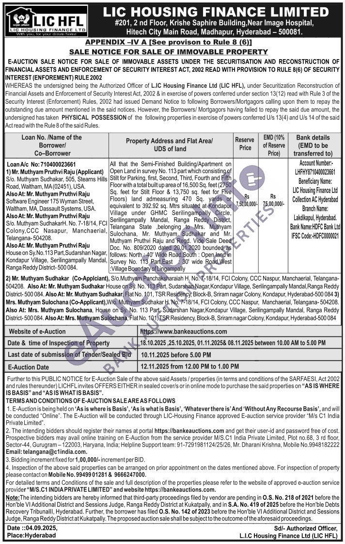All that the Semi-Finished Building/Apartment on Open Land in survey No. 113 part which consisting of Stilt for Parking, first, Second, Third, Fourth and Fifth Floor with a total built up area of 16,500 Sq. feet (2750 Sq. feet for Stilt Floor & 13,750 sq. feet for Five Floors) land admeasuring 470 Sq. yards or equivalent to 392.92 sq. Mtrs situated at Kondapur Village under GHMC Serilingampally Circle, Serilingampally Mandal, Ranga Reddy District, Telangana State belonging to Mrs. Muthyam Sulochana, Mr. Muthyam Sudhakar and Mr. Muthyam Pruthvi Raju and Regd. Vide Sale Deed Doc. No. 809/2020 dated 20.01.2020 bounded as , follows: North: 40 Wide Road, South: Open land in , Survey No. 113 Part. East: 30' wide Road, West Village Boundary of Lingampally
