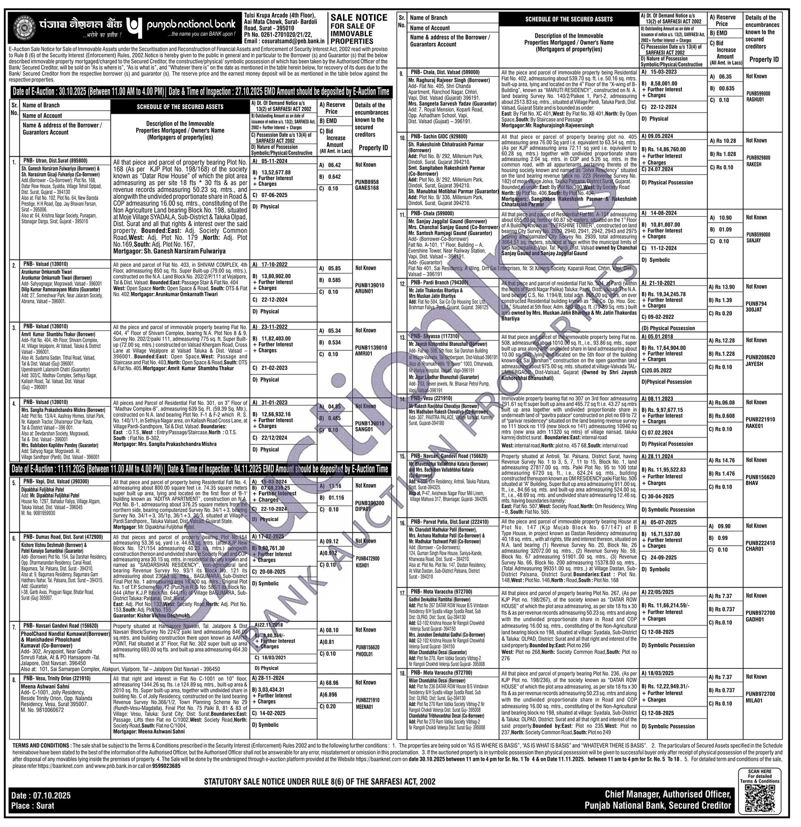 All that right and interest in Flat No C-1001 on 10 floor, admeasuring 1344.26 sq. fts. i.e 124.89 sq. mtrs., built-up area & 2010 sq. fts. Super built-up area, together with undivided share in building No. C of Jolly Residency, constructed on the land bearing Revenue Survey No.366/1/2, Town Planning Scheme No 29 (Rundh-Vesu-Magdalla), Final Plot No. 75 Paiki B, 81 & 83 of Village: Vesu, Taluka: Surat City, Dist: Surat. Boundaries: East: Passage, Lifts then Flat no C/1002, West: Society Road, North: Society Road, South: Flat no C/1004, Mortgagor: Meena Ashwani Sahni