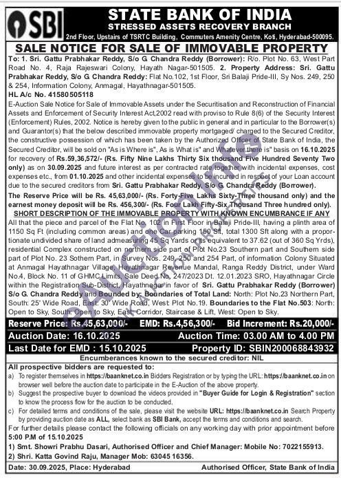 All that the piece and parcel of the Flat No. 102 in First Floor in Balaji Pride-III, having a plinth area of 1150 Sq Ft (including common areas) and one Car parking 150 Sft, total 1300 Sft along with a propor-tionate undivided share of land admeasuring 45 Sq Yards or its equivalent to 37.62 (out of 360 Sq Yrds). residential Complex constructed on northern side part of Plot No.23 Southern part and Southem side part of Plot No. 23 Sothem Part, in Survey Nos. 249, 250 and 254 Part, of information Colony Situated at Anmagal Hayathnagar Village, Hayathnagar Revenue Mandal, Ranga Reddy District, under Ward No.4, Block No. 11 of GHMC Limits, Sale Deed No. 247/2023 Dt. 12.01.2023 SRO, Hayathnagar Circle within the Registration Sub-District, Hayathnagar in favor of Sri. Gattu Prabhakar Reddy (Borrower) S/o G. Chandra Reddy and Bounded by: Boundaries of Total Land: North: Plot No.23 Northern Part, South: 25' Wide Road, East: 30' Wide Road, West: Plot No. 19. Boundaries to the Flat No.503: North: Open to Sky, South: Open to Sky, East: Corridor, Staircase & Lift, West: Open to Sky.
