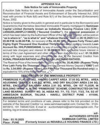 PRIMEROSE FLAT NO. 102, HAVING CARPET AREA 37.05 SQ. MTRS., AREA ADJOINING TERRACE 6.49 SQ. MTRS., AND DRY BALCONY AREA 2.94 SQ. MTRS., ENCLOSED BALCONY AREA 2.81 SQ. MTRS., ON 1ST FLOOR, IN BUILDING/WING-A, IN THE "PRIMEROSE" SCHEME, CONSTRUCTED ON THE LAND BEARING SUREVY NO. 36, HISSA NO. 7/1, 7/2, 7/3/1, 7/3/2, 7/4, 5/2 AT AMBEGAON BUDRUK, TALUKA HAVELI, DISTRICT PUNE - 411046, MAHARASHTRA