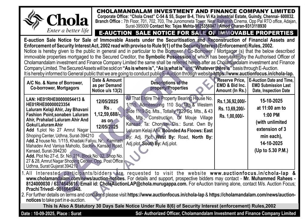 All That Entire The Property Bearing House No. 1/115, Admeasuring 110 Sq. Mts.& Western Side 1119 Sq. Mts., Totlally 1229 Sq. Mts., & 43 Sq. Mts., Construction, Of Mouje Village Kansad, Ta: Choryasi, Dis.: Surat. Own By Laluram Kelaji Ahir. Bounded As Floows: East By: Adj. Plot, West By: Road, North By: Adj.plot, South By: Adj.plot