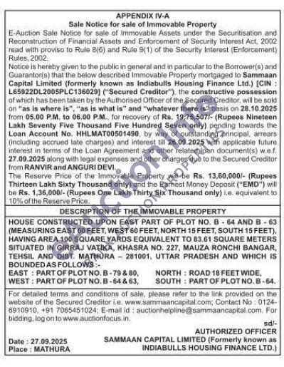 HOUSE CONSTRUCTED UPON EAST PART OF PLOT NO. B 64 AND B-63 (MEASURING EAST 60 FEET, WEST 60 FEET, NORTH 15 FEET, SOUTH 15 FEET), HAVING AREA 100 SQUARE YARDS EQUIVALENT TO 83.61 SQUARE METERS SITUATED IN GIRRAJ VATIKA, KHASRA NO. 227, MAUZA RONCHI BANGAR, TEHSIL AND DIST. MATHURA 281001, UTTAR PRADESH AND WHICH IS BOUNDED AS FOLLOWS:-EAST PART OF PLOT NO. B-79 & 80, WEST: PART OF PLOT NO.B-64 & 63, NORTH ROAD 18 FEET WIDE, SOUTH PART OF PLOT NO.B-64