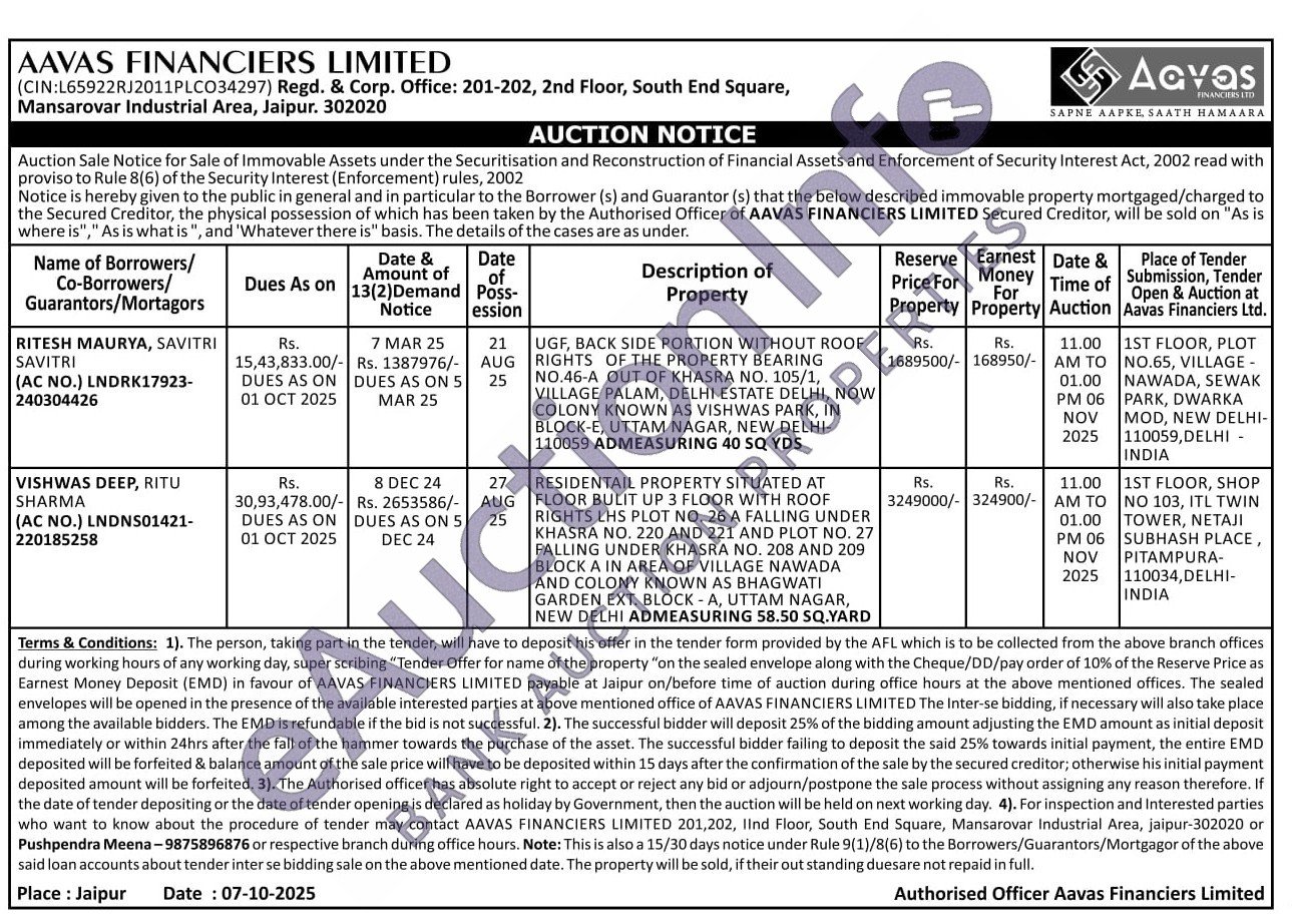 RESIDENTAIL PROPERTY SITUATED AT FLOOR BULIT UP 3 FLOOR WITH ROOF RIGHTS LHS PLOT NO. 26 A FALLING UNDER KHASRA NO. 220 AND 221 AND PLOT NO. 27 FALLING UNDER KHASRA NO. 208 AND 209 BLOCK A IN AREA OF VILLAGE NAWADA AND COLONY KNOWN AS BHAGWATI GARDEN EXT. BLOCK-A, UTTAM NAGAR, NEW DELHI ADMEASURING 58.50 SQ.YARD