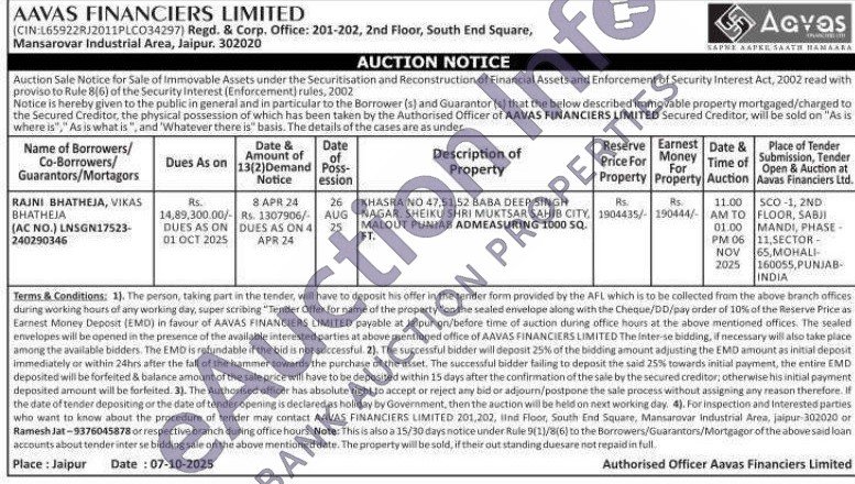KHASRA NO 47,51,52 BABA DEEP SINGH NAGAR SHEIKU SHRI MUKTSAR SAHIB CITY, MALOUT PUNJAB ADMEASURING 1000 SQ. FT.