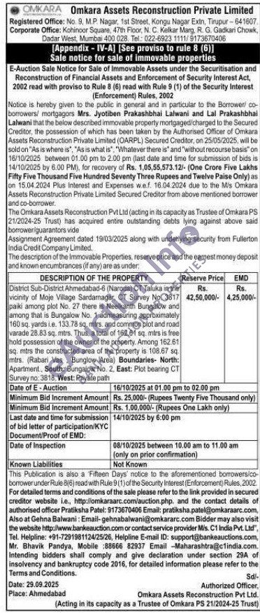 District Sub-District Ahmedabad-6 (Naroda) CT Taluka in the vicinity of Moje Village Sardamagar, CT Survey No. 3817 paiki among plot No. 27 there is Neelkanth Bungalow and among that is Bungalow No. 1 admeasuring approximately 160 sq. yards i.e. 133.78 sq. mtrs. and common plot and road varade 28.83 sq. mtrs. Thus, a total of 162.61 sq. mtrs is free hold possession of the owner of the property, Among 162.61 sq. mtrs the constructed area of the property is 108.67 sq. mirs. (Rabari Vas, Bunglow Area) Boundaries- North: Apartment, South: Bungalow No. 2. East: Plot bearing CT Survey no: 3818, West: Private path