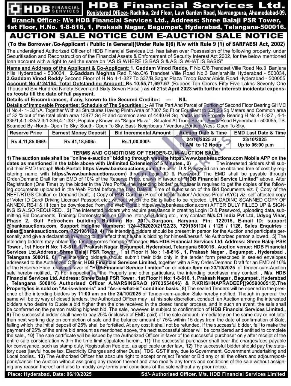 "All That The Flat No.G-1 Bearing MCH No. 6-1-399/4/G-1 on the Ground Floor of the Building Know as "Imperial Residence", Bearing Municipal No. 6-1-339/4, Having A Plinth Area of 1450 Sq. Ft (Including Comman Area And Balconies) Along With Undivided Share of Land Admeasuring 49 Sq. Yads., out of 488.27 Sq. Yards Situated At Padmarao Nagar Boundaries As; (North Open To Sky Road) (South-Open To Sky) (East - Parking Space) (West - Flat No G-2)