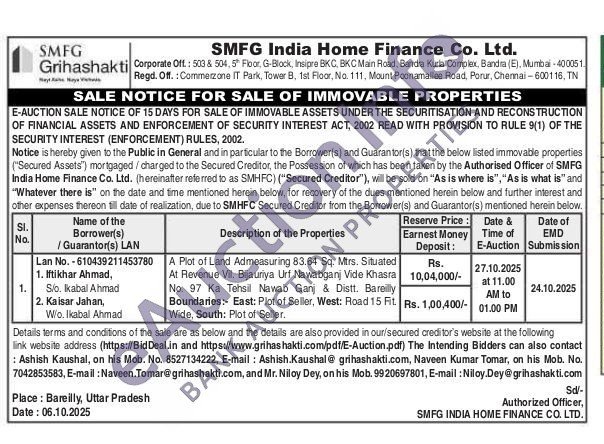 A Plot of Land Admeasuring 83.64 Sq. Mtrs. Situated At Revenue Vil. Bijauriya Urf Nawabganj Vide Khasra No. 97 Ka Tehsil Nawab Ganj & Distt. Bareilly Boundaries: East: Plot of Seller, West: Road 15 Fit Wide, South: Plot of Seller