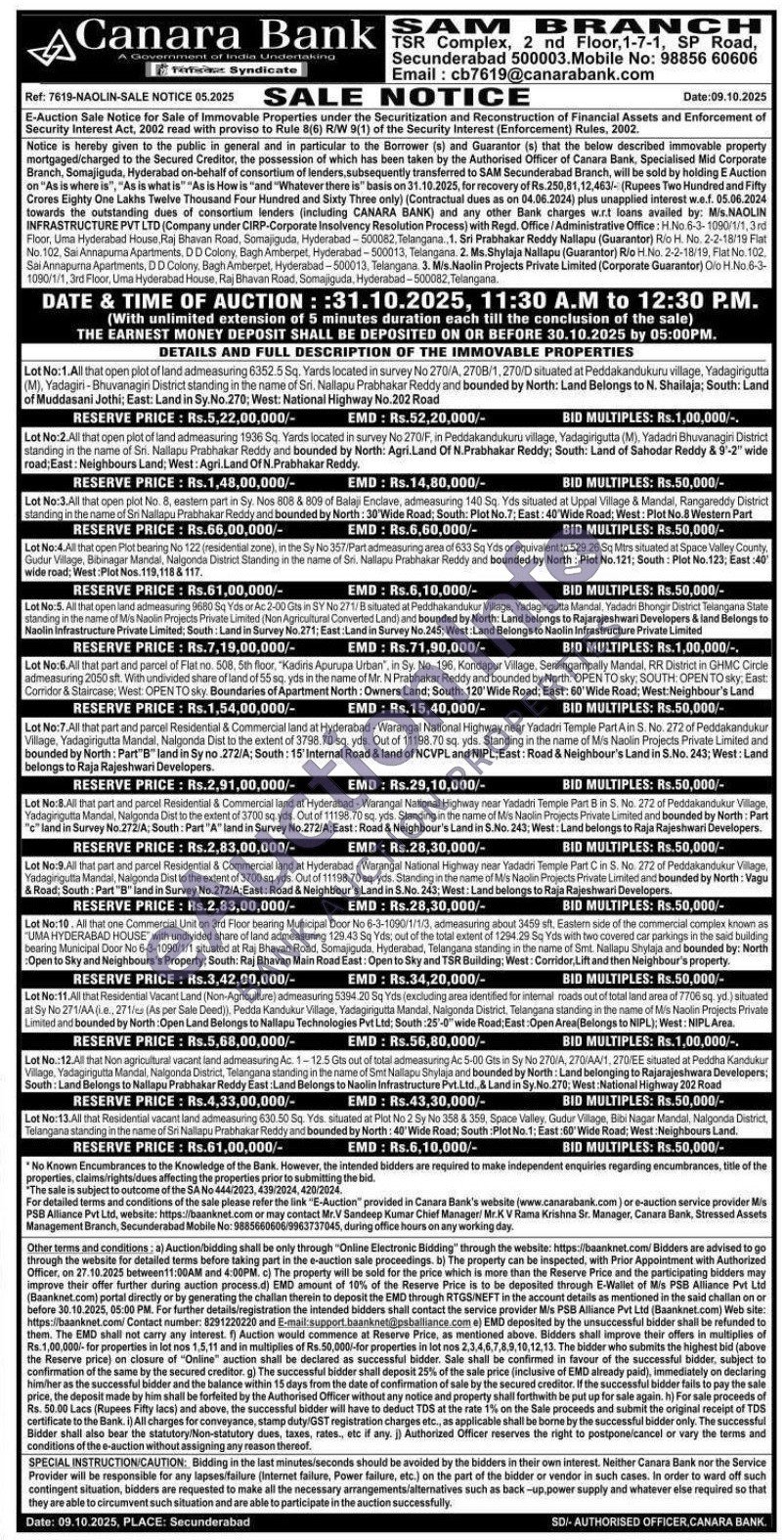 Lot No:9.All that part and parcel Residential & Commercial land at Hyderabad-Warangal National Highway near Yadadri Temple Part C in S. No. 272 of Peddakandukur Village, Yadaginigutta Mandal, Nalgonda Dist to the extent of 3700 sq yds. Out of 11198.70 sq. yds. Standing in the name of M/s Nacilin Projects Private Limited and bounded by North: Vagu & Road: South: Part "B" land in Survey No.272/A; East: Road & Neighbour's Land in S.No. 243; West: Land belongs to Raja Rajeshwari Developers.