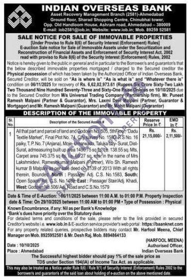 All that part and parcel of land and Godown No. 505, 5th Floor, Dadu Textile Market", Final Plot No. 74, City survey No. 1580 RS No. 16 paliky, T.P. No. 7 (Anjana), Moje-Umanwada, Taluka City-Surat, Dist-Surat, admeasuring built up area 1490.75 sq fts, ie. 138.55 sq. Mts, Carpet area 745.375 sq fts, ie. 69.27 sq. mts, in the name of Mirs Lakshmidevi. Rameshkumar Malpani (Partner), Wilo Sh. Ramesh kumar B Malpani as per sale deed no 8139 of 2013 With all rights therein, Bounded North Passage Adj. C.S. No. 1583, South; Open Space Adj. C.S. No. 1469, East: Passage/Stair/Adj. Khadi, West: Godown No. 506/Adj. Road and C.S.No. 1579
