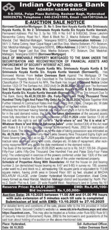 Schedule of Properties Along With Boundaries: All that the house on plot bearing number 3, (on demolished house bearing no. 6-67 and 9-80) in survey no. 159, covered under ward no.2 and block no.2, admeasuring 136 square yards or equivalent to 113.69 square meters, having plinth area in Ground Floor: 661 sq feet, situated at MACHA BOLARUM VILLAGE, under Greater Hyderabad Municipal Corporation, Alwal Circle, newly formed as Alwal Mandal, Medchal-Malkajgin district and bounded by: North: Plot no.2, South: Plot no.4, East: 25 wide RoadM West:: Neighbour's land in Survey No.161