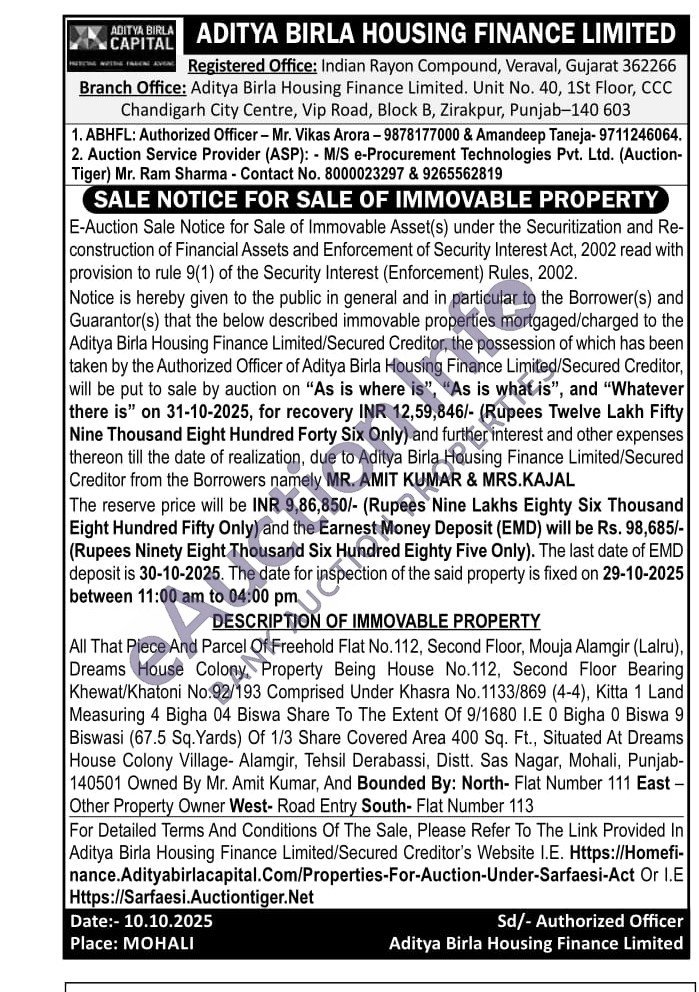 All That Piece And Parcel Of Freehold Flat No. 112, Second Floor, Mouja Alamgir (Lalru), Dreams House Colony, Property Being House No.112, Second Floor Bearing Khewat/Khatoni No.92/193 Comprised Under Khasra No.1133/869 (4-4), Kitta 1 Land Measuring 4 Bigha 04 Biswa Share To The Extent Of 9/1680 I.E 0 Bigha 0 Biswa 9 Biswasi (67.5 Sq. Yards) Of 1/3 Share Covered Area 400 Sq. Ft., Situated At Dreams House Colony Village- Alamgir, Tehsil Derabassi, Distt. Sas Nagar, Mohali, Punjab-140501 Owned By Mr. Amit Kumar, And Bounded By: North- Flat Number 111 East -Other Property Owner West- Road Entry South- Flat Number 113