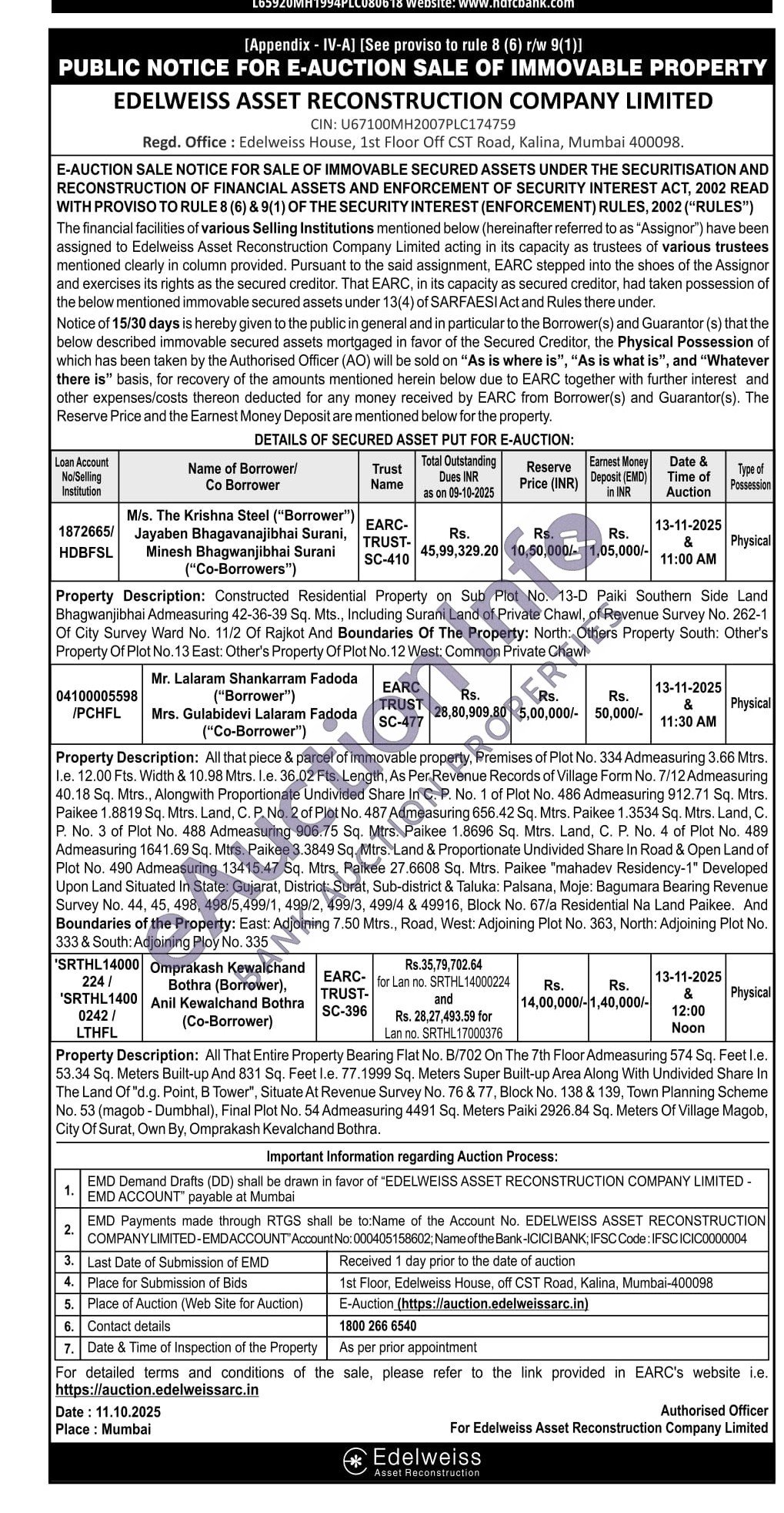 Property Description: All that piece & parcel of immovable property, Premises of Plot No. 334 Admeasuring 3.66 Mtrs. I.e. 12.00 Fts. Width & 10.98 Mtrs. 1.e. 36.02 Fts. Length, As Per Revenue Records of Village Form No. 7/12 Admeasuring 40.18 Sq. Mtrs., Alongwith Proportionate Undivided Share In C. P. No. 1 of Plot No. 486 Admeasuring 912.71 Sq. Mtrs. Paikee 1.8819 Sq. Mtrs. Land, C. P. No. 2 of Plot No. 487 Admeasuring 656.42 Sq. Mtrs. Paikee 1.3534 Sq. Mtrs. Land, C. P. No. 3 of Plot No. 488 Admeasuring 906.75 Sq. Mtrs. Paikee 1.8696 Sq. Mtrs. Land, C. P. No. 4 of Plot No. 489 Admeasuring 1641.69 Sq. Mtrs. Paikee 3.3849 Sq. Mtrs. Land & Proportionate Undivided Share In Road & Open Land of Plot No. 490 Admeasuring 13415.47 Sq. Mtrs. Paikee 27.6608 Sq. Mtrs. Paikee "mahadev Residency-1" Developed Upon Land Situated In State: Gujarat, District: Surat, Sub-district & Taluka: Palsana, Moje: Bagumara Bearing Revenue Survey No, 44, 45, 498, 498/5,499/1, 499/2, 499/3, 499/4 & 49916, Block No. 67/a Residential Na Land Paikee. And Boundaries of the Property: East: Adjoining 7.50 Mtrs., Road, West: Adjoining Plot No. 363, North: Adjoining Plot No. 333 & South: Adjoining Ploy No. 335