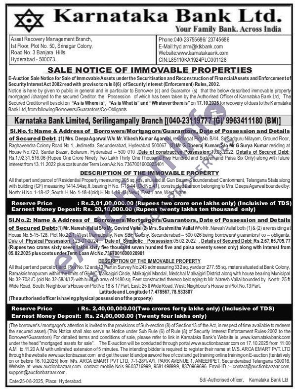 All that part and parcel of Residential Property measuring 305 sq. yds, situated at Gun Bazar, Secunderabad Cantonment, Telangana State along with building (GF) measuring 1414.94sq.ft, bearing H No. 1-18-44 (Old No.41), constructed thereon belonging to Mrs. Deepa Agarwal bounded by: North: H.No. 1-18-42, South: H.No. 1-18-4(old) H.No 1-18-43 (New), East. Lane, West: Lane