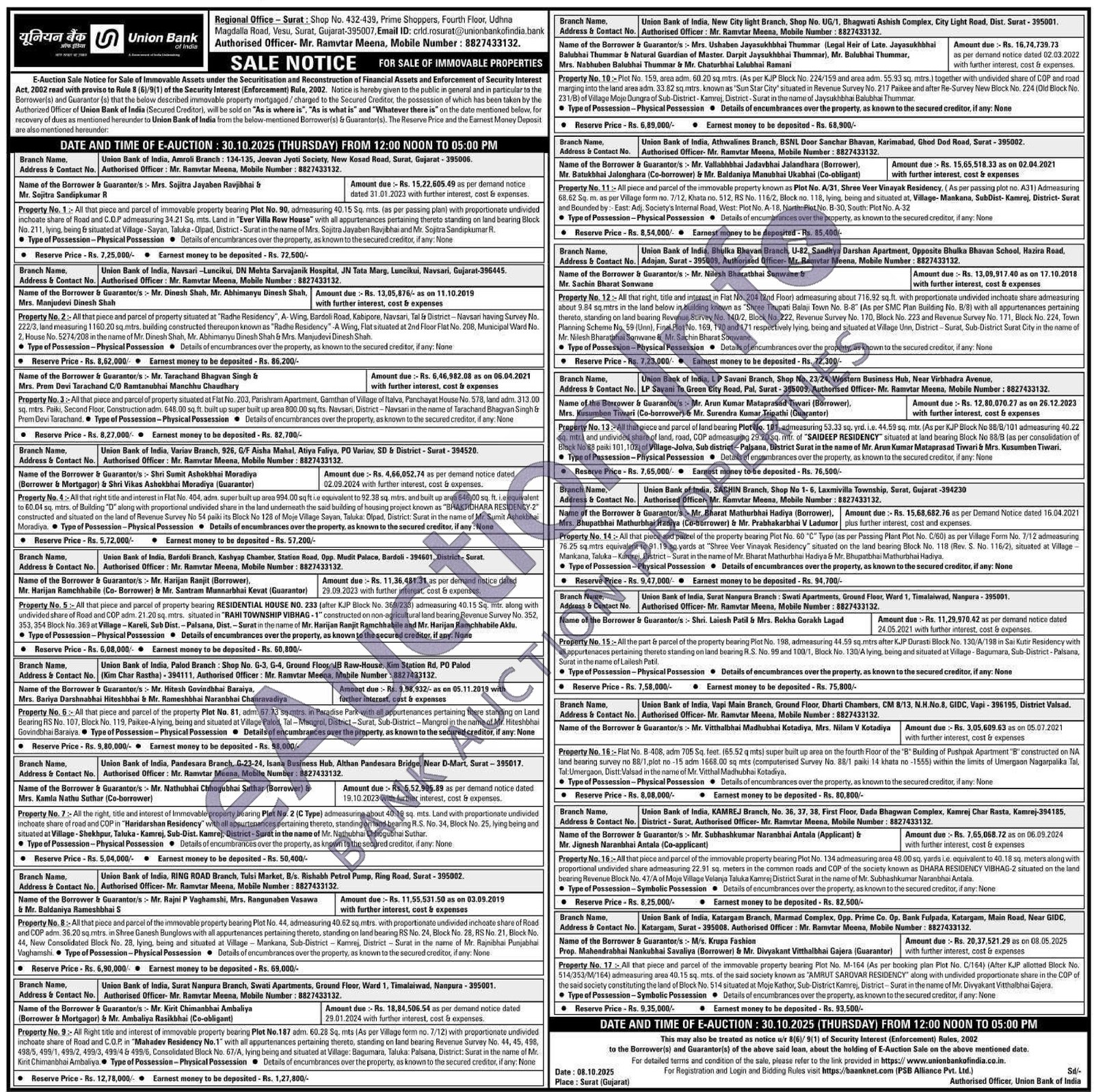 Property No. 1: All that piece and parcel of immovable property bearing Plot No. 90, admeasuring 40.15 Sq. mts. (as per passing plan) with proportionate undivided inchoate share of Road and C.O.P admeasuring 34.21 Sq. mts. Land in "Ever Villa Row House" with all appurtenances pertaining thereto standing on land bearing Block No. 211, lying, being & situated at Village-Sayan, Taluka-Olpad, District-Surat in the name of Mrs. Sojitra Jayaben Ravjibhai and Mr. Sojitra Sandipkumar R