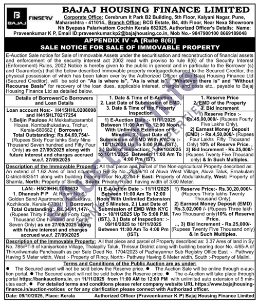 All that piece and parcel of Property described as: 3.37 Ares of land in Sy No. 785/PT-9 of kaniyarkode Village, Thalapilly Taluk, Thrissur District along with building bearing door No. 4/65-A of Thiruvilwamala Panchayath as per Sale Deed No. 1704/2023 of Pazhayannur Sub Registry Office East: Pathway Having 5 Meter width, West: Property of Rincy, North:- Pathway Having 6 Meter width, South:-Property of Malini.