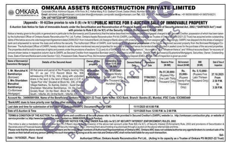 All that piece and parcel of the Property bearing Vila No. 61 as per 7/12 Record Block No. 836 admeasuring 418.32 Sq. mtrs, along with undivided share in the land in the land of Road and COP in Apple Pool Villa Situated at Block No. 206, of Moje Village Haldhanu, Ta. Kamrej, Distict-Surat Own by Shandabee Manubhai Bambhaniya. On the East Society Road On the West-Block No. 2105, On the South Villa No. 45. On the North-Ville No: 43
