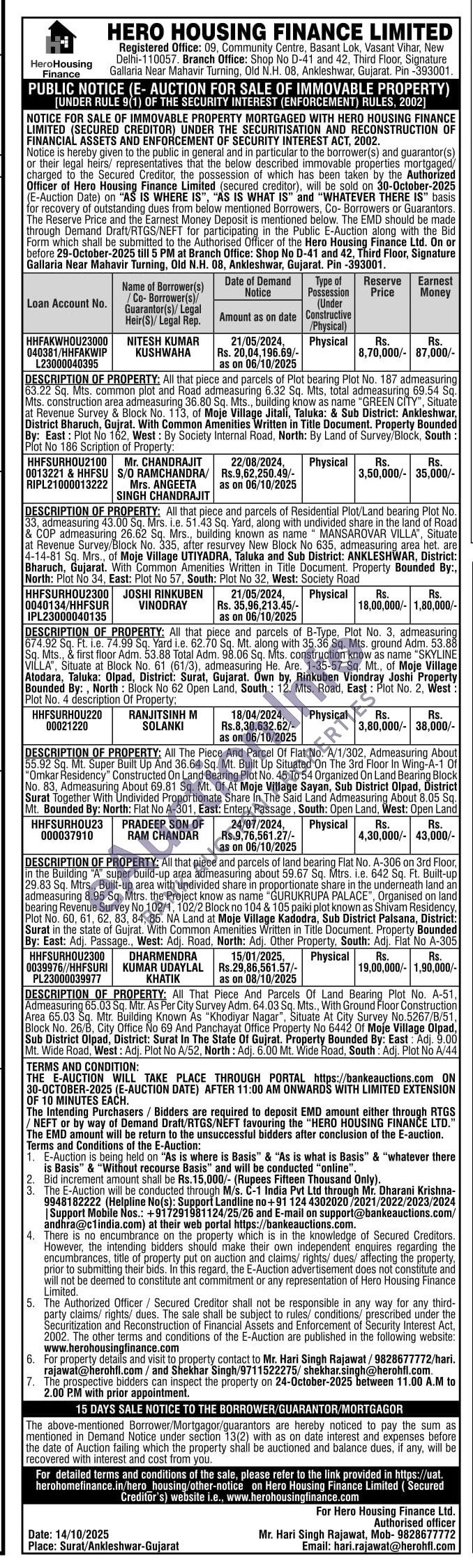DESCRIPTION OF PROPERTY: All that piece and parcels of land bearing Flat No. A-306 on 3rd Floor, in the Building "A" super build-up area admeasuring about 59.67 Sq. Mtrs. i.e. 642 Sq. Ft. Built-up 29.83 Sq. Mtrs., Built-up area with undivided share in proportionate share in the underneath land an admeasuring 8.95 Sq. Mtrs. the Project know as name "GURUKRUPA PALACE", Organised on land bearing Revenue Survey No 102/1, 102/2 Block no 104 & 105 paiki plot known as Shivam Residency, Plot No. 60, 61, 62, 83, 84, 85. NA Land at Moje Village Kadodra, Sub District Palsana, District: Surat in the state of Gujrat. With Common Amenities Written in Title Document. Property Bounded By: East: Adj. Passage., West: Adj. Road, North: Adj. Other Property, South: Adj. Flat No A-305