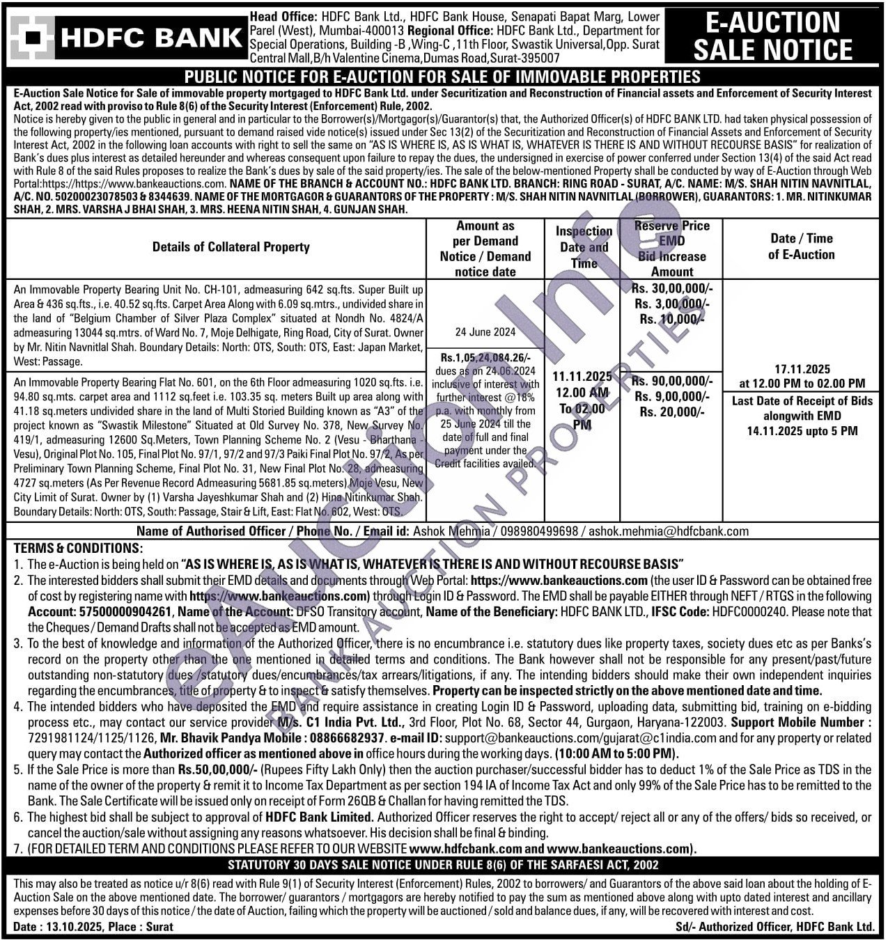 An Immovable Property Bearing Unit No. CH-101, admeasuring 642 sq.fts. Super Built up Area & 436 sq.fts., i.e. 40.52 sq.fts. Carpet Area Along with 6.09 sq.mtrs., undivided share in the land of "Belgium Chamber of Silver Plaza Complex" situated at Nondh No. 4824/A admeasuring 13044 sq.mtrs. of Ward No. 7, Moje Delhigate, Ring Road, City of Surat. Owner by Mr. Nitin Navnitlal Shah. Boundary Details: North: OTS, South: OTS, East: Japan Market, West: Passage.