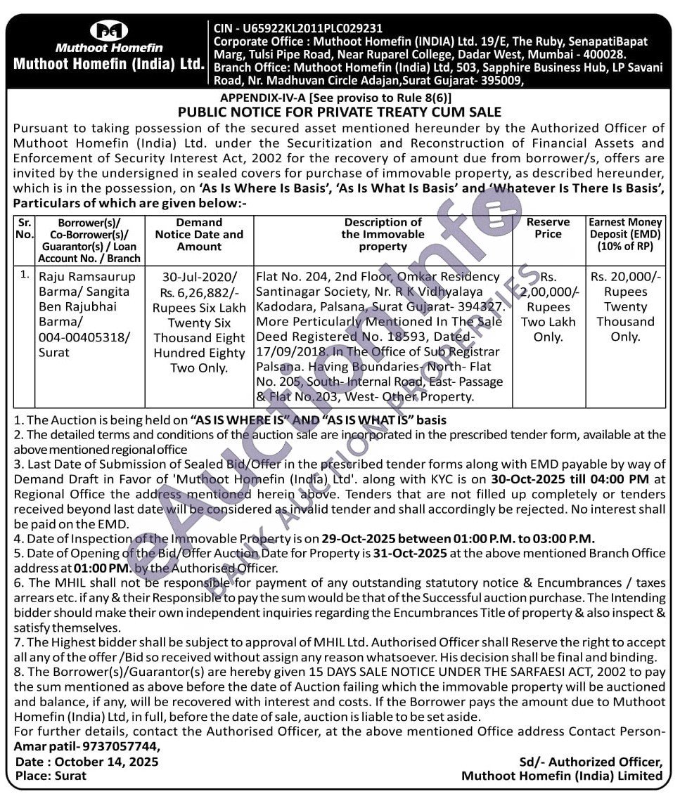 Flat No. 204, 2nd Floor, Omkar Residency Santinagar Society, Nr. R K Vidhyalaya Kadodara, Palsana, Surat Gujarat- 394327. More Perticularly Mentioned In The Sale Deed Registered No. 18593, Dated-17/09/2018. In The Office of Sub Registrar Palsana. Having Boundaries- North- Flat No. 205, South- Internal Road, East- Passage & Flat No.203, West- Other Property.