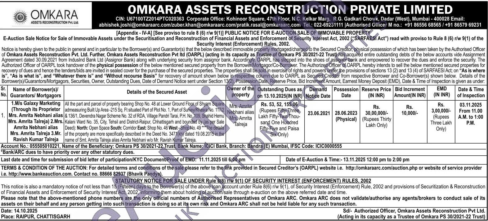 All the part and parcel of property bearing Shop No. 48 at Lower Ground Floor of Shyam Square admeasuring Built Up Area -215 Sq. Ft situated Part of Plot No. 1, Part of Survey/Khasra No. 117/2 & 136/1, Devendra Nagar Scheme No. 32 of RDA Village Pandri Tarai, P.H. No. 109, Shahid Hemu . Kalani Ward No. 35, City, Tehsil and District-Raipur, Chhattisgarh and bounded by (as per Sale Deed): North: Open Space South: Corridor East: Shop No. 46 West-Shop No. 49 ***The details of the property are more specifically described in the Deed No. 3471(kh) dated 19.08.2015 in the name of Smt. Amrita Talreja alias Amrita Nebhani w/o Mr. Ravish Kumar Taireja.