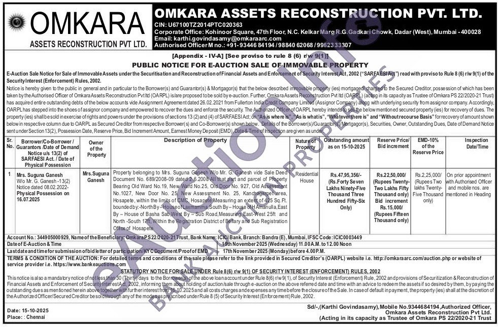 Property belonging to Mrs. Suguna Ganesh W/o Mr. G. Ganesh vide Sale Deed Document No. 689/2008-09 dated 2.6.2008 All that part and parcel of Property Bearing Old Ward No. 19, New Ward No.25, Old Door No. 927, Old Assessment No.1027, New Door No. 25, New Assessment No. 25, Kanchagarpet area, Hosapete, within the limits of CMC, Hosapete Measuring an extent of 425 Sq.Ft. boundedby:-NorthBy-House of Laxmamma, South By-House of H Amanulla, East ByHouse of Basha Sab, West By-Sub Road, Measuring East-West 25ft and North-South 17ft. Within the Registration District of Bellary and Sub Registration Office of Hosapete