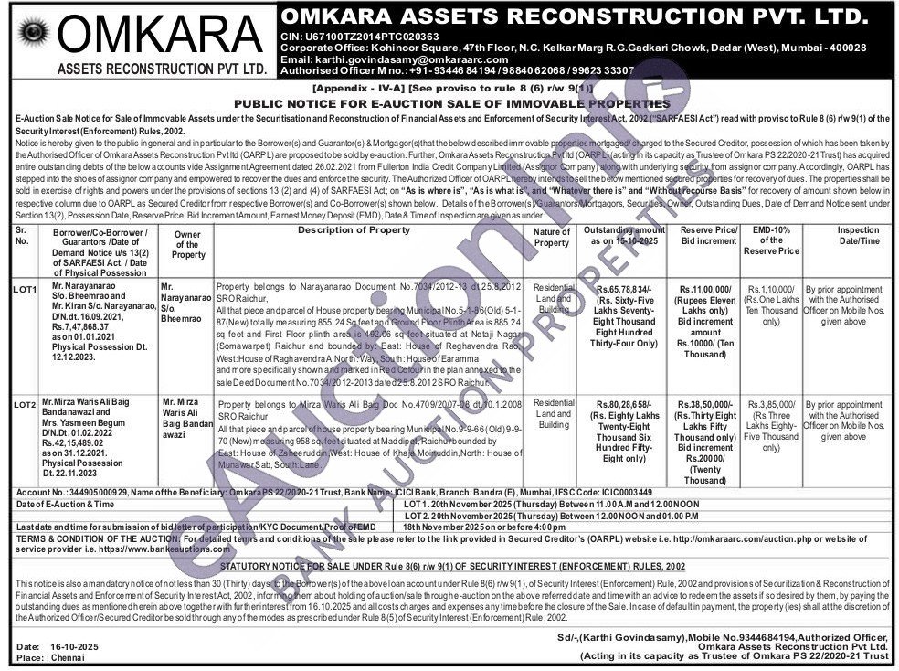 Property belongs to Mirza Waris Ali Baig Doc No.4709/2007-08 dt. 10.1.2008 SRO Raichur : All that piece and parcel of house property bearing Municipal No.9-9-66(Old)9-9-70 (New) measuring 958 sq. feet situated at Maddipet, Raichurbounded by East: House of Zaheeruddin, West: House of Khaja Moinuddin, North: House of Munawar Sab, South:Lane
