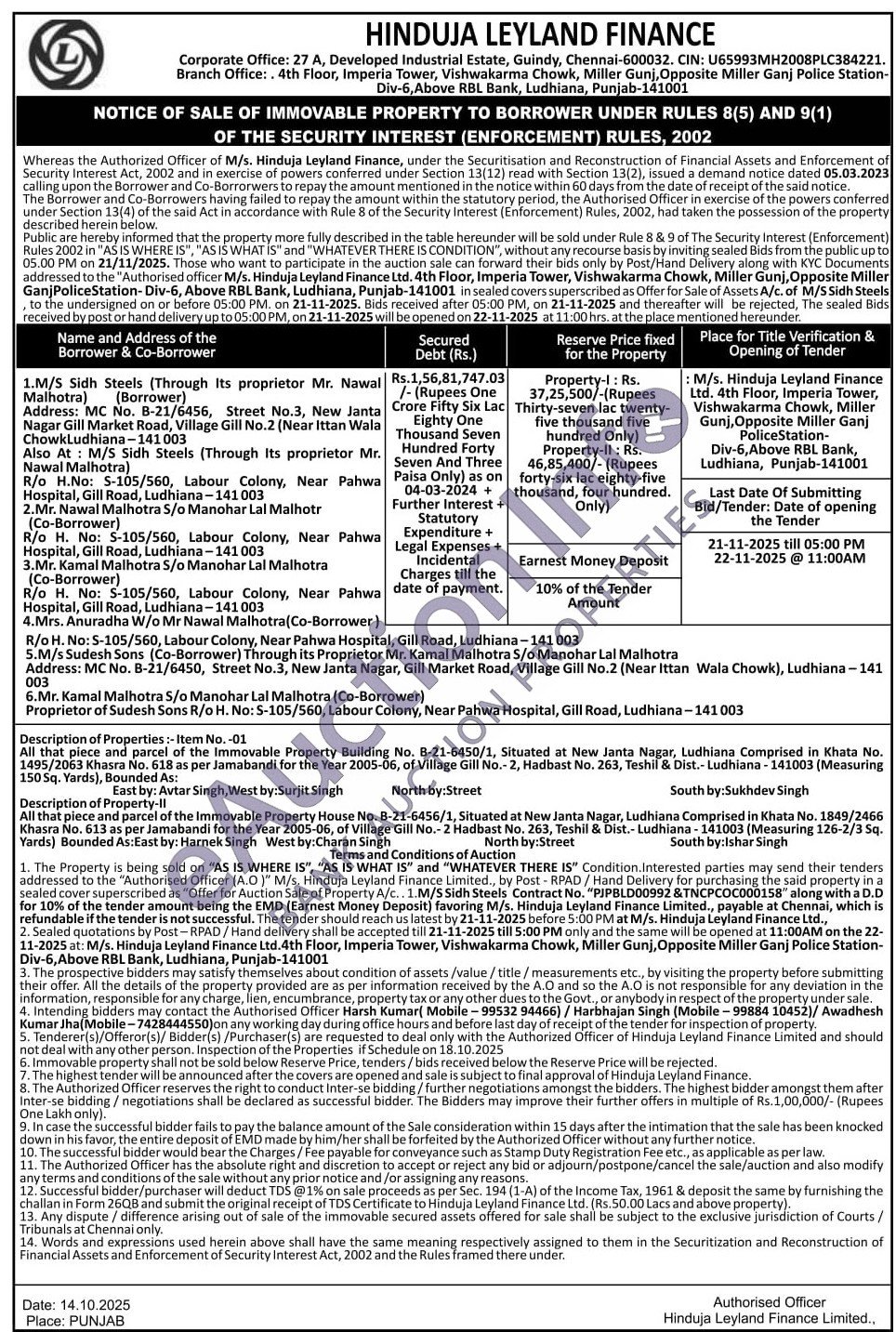 Description of Properties:- Item No.-01 : All that piece and parcel of the Immovable Property Building No. B-21-6450/1, Situated at New Janta Nagar, Ludhiana Comprised in Khata No. 1495/2063 Khasra No. 618 as per Jamabandi for the Year 2005-06, of Village Gill No.- 2, Hadbast No. 263, Teshil & Dist.- Ludhiana-141003 (Measuring 150 Sq. Yards), Bounded As: East by: Avtar Singh, West by: Surjit Singh North by:Street South by:Sukhdev Singh