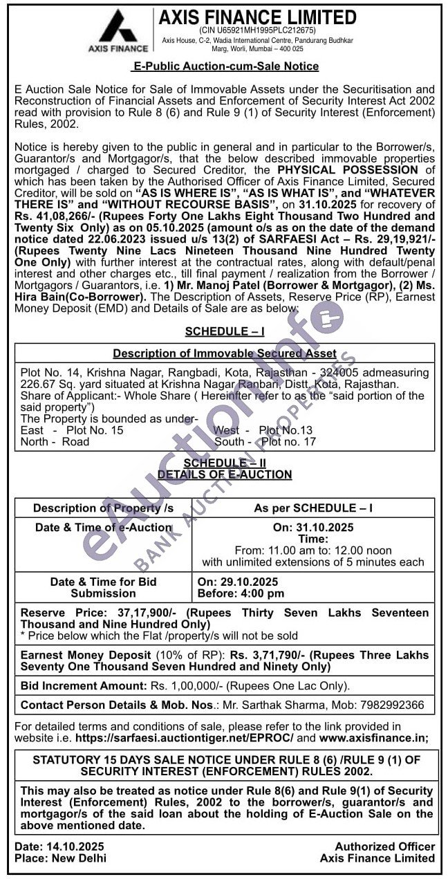 Plot No. 14, Krishna Nagar, Rangbadi, Kota, Rajasthan 324005 admeasuring 226.67 Sq. yard situated at Krishna Nagar Ranbari, Distt. Kota, Rajasthan. Share of Applicant:- Whole Share (Hereinfter refer to as the "said portion of the said property")