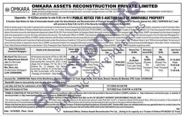All that piece and parcel of Flat no. 804, 8th Floor of Sun Star CHSL, constructed on All that piece and parcel of Flat no. 804, 8th land bearing Rev. Survey No. 223/1, in the village limit of Adajan, F.P. No. 90 in T.P. Scheme No. 13 (Adajanj, City Taluka Surat Area: 1200 Sq. Ft. On the East -Flat No. 805, On the West: -OTS, On the South Passage. On the North-Open Space