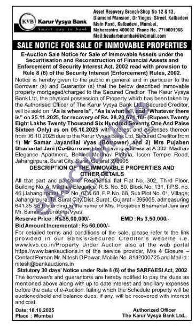 All that part and parcel of Residential flat Flat No. 302, Third Floor, Building No. A, Madhav Elegance, R.S. No. 80, Block No. 131, T.P.S. no. 46 (Jahangirpura), F.P. No. 67 & 68, F.P. No. 68, Sub Plot No. 01, Village; Jahangirpura, Ta. Surat City, Dist. Surat, Gujarat-395005, admeasuring 641.85 Sq.ft standing in the name of Mrs. Poojaben Bhamarlal Jani and Mr. Samar Jayentibhai Vyas.