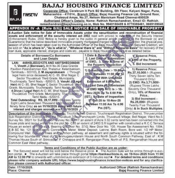 Tiruchirappalli District, Tiruchirapall Registration District, Thiruverumber Sub Registration District, within the Thuvakudi Town Panchayath Limits. Thuvakud Village, Bell Nagar, Ward No.5, Survey No. 382/1 for Sub Division Survey No 382/1T an estent of Acre 3.32 cents land has been converted into the house plots and layout within this the plot No. C85 an extent of 2400 S ft together with constructed a RCC Тетасе House an extent of 1000 sq ft. Bearing Old Door No. 37/G New Door No. 105. House Tax Assessment No. 1594, EB SC No 121 with Electric Connection, Meter, Meter Deposit, Latnine. Bath Room, Bore well, 1/2 HP Motor, Compound Wail. Coconut Trees and common pathway, all easement and pathway rights is situated within the fol-lowing four boundaries. West of Shanmugasundaram House and North South Common Pathway, East of: KM Thomas House South of Srinivasan. P Chinappe and R. Rangarajan Plots, North of P.S. Renganathan House and Common East West pathway