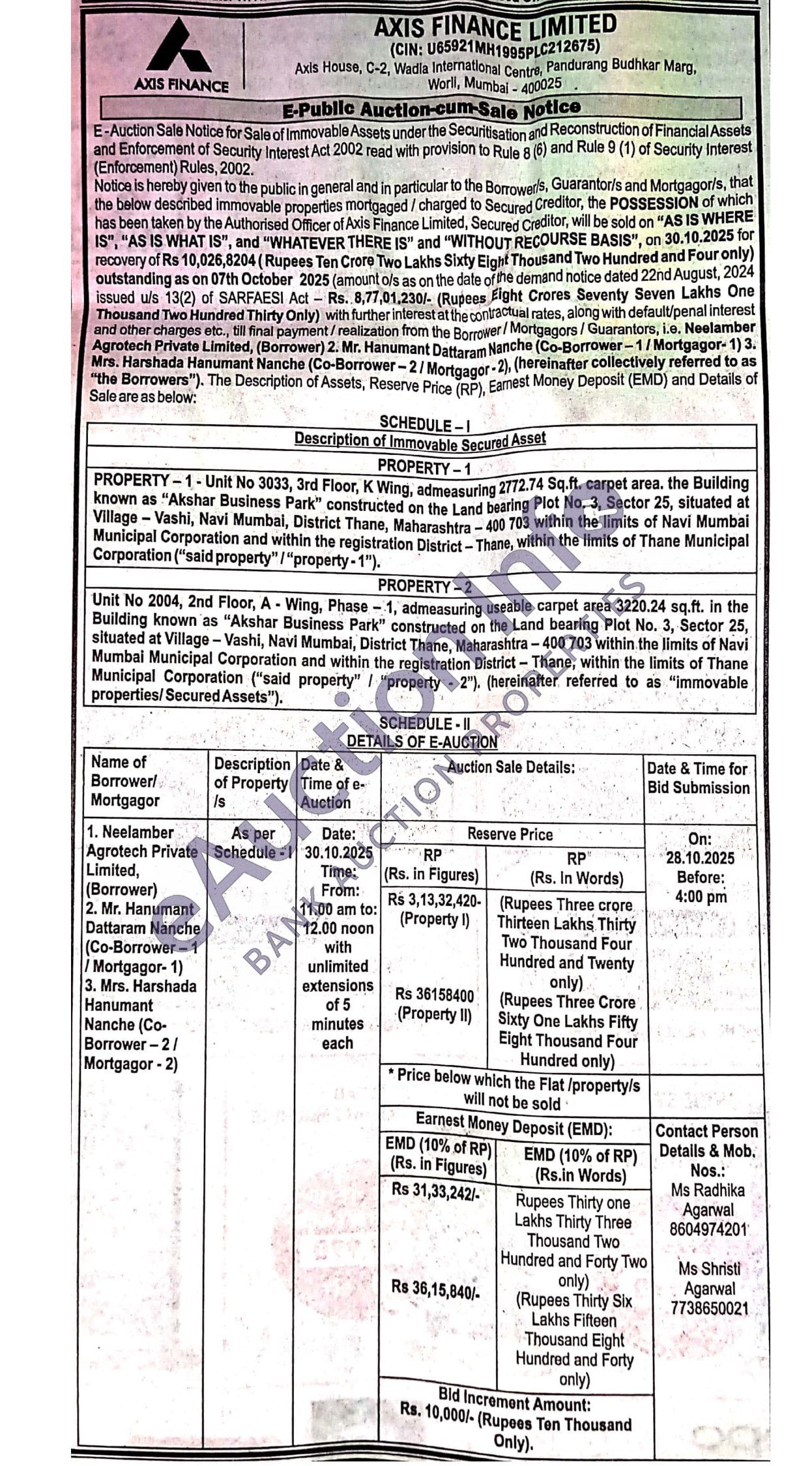 PROPERTY-1-Unit No 3033, 3rd Floor, K Wing, admeasuring 2772.74 Sq.ft. carpet area, the Building known as "Akshar Business Park" constructed on the Land bearing Plot No. 3, Sector 25, situated at Village - Vashi, Navi Mumbal, District Thane, Maharashtra-400 703 within the limits of Navi Mumbai Municipal Corporation and within the registration District-Thane, within the limits of Thane Municipal Corporation ("said property"/"property-1").