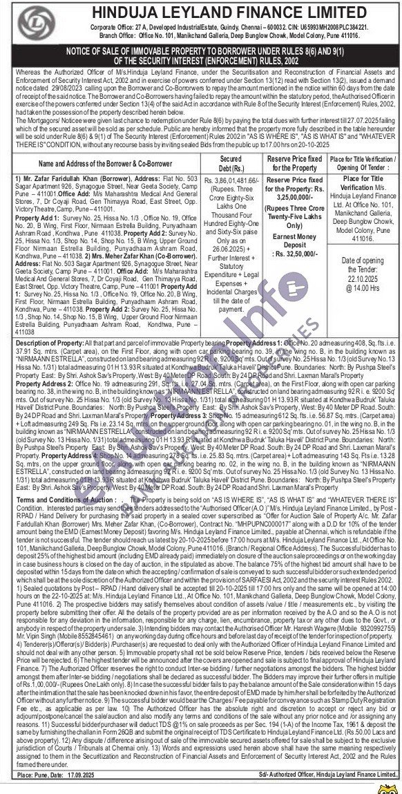 Description of Property: All that part and parcel of immovatie Property bearing Property Address 1: Ofice No. 20 admeasuring 408, Sq. fsi.e 37.91 Sq. mirs. (Carpet area), on the First Fibor, along with open car parking bearing no. 39, in the wing no. B, in the building known as "NIRMAANN ESTRELLA", constructed on land bearing admeasuring 92 Ri.e. 9200 So'mits. Out of survey No. 25 Hissa No. 1/3 (old Survey No. 13 Hasa Noi. 1/31) totaladineasuring 01H 13.93R situated at Kondhwa Budruk Taluka Havell District Pune. Boundaries: North: By Pushpa Steel's Property East: By Shri, Ashok Sav's Property, West: By 40 Meter DP Road South By 24DP Road and Shri. Laxman Maral's Property Property Address 2: Office No. 19 admeasuring 291, Sq.fts.ie. 27.04 Sq. mirs. (Carpetarea), on the First Floor, along with open car parking bearing no. 38, in the wing no. B, in the building known as "NIRMAANN ESTRELLA", constructed on land bearing admeasuring 92R 9200 Sq mls. Out of survey No. 25 Hissa No. 1/3 (old Survey No. 13 Hissa No. 1/31) total admeasuring 01 H13.93R situated at Kondhwa Budruk Taluka Havell District Pune. Boundaries: North: By Pushpa Steel's Property East: By Shri Ashok Sav's Property. West: By 40 Meter DP Road. South By 24 DP Road and Shri. Laxman Maral's Property: Property Address 2 Shop No. 15 admeasuring 612 Sq. ft.ie. 56.87 Sq. mitrs. (Carpetama) Loft admeasuring 249 Sq. Fts in. 23.14 Sq. mers, on the upperground floor, along with open car parking bearing no. 01, in the wing no. 8, in the building known as "NIRMAANN ESTRELLA", constructed on land bearing admeasuring 92 Rie. 9200 Sq mis. Out of survey No. 25 Hissa No. 1/3 (old Survey No. 13 Hissa No. 1/31) total adimeasuing 01 H 13.93 R situated at Kondhwa Budruk' Taluka Haveli District Pune. Boundaries: North By Pushpa Steel's Property East By Shri. Ashok Sav's Property, West By 40 Meter DP Road South: By 24 DP Road and Shri Laxman Maral's Property Property Address 4: Shop No. 14 admeasuring 278 Sq fts. ie.25.83 Sq.mtrs. (Carpet area)+Loft admeasuring 143 Sq. Ftsie. 13.28 Sq. miles, on the upper ground floor, along with open car parking bearing no. 02, in the wing no. B, in the building known as "NIRMAANN ESTRELLA", constructed on land beating admeasuring 92 Rie. 9200 Sq mts. Out of survey No. 25 Hissa No. 1/3 (old Survey No. 13 Hissa No 1/31) total admeasuring 01H 13.93R situated at Kondhwa Budruk Taluka Havell District Pune. Boundaries: North: By Pushpa Steel's Property East: By Shri. Ashok Sav's Property, West By 40 Meter DP Road. South: By 24DP Road and Shri. Laxman Maral's Property