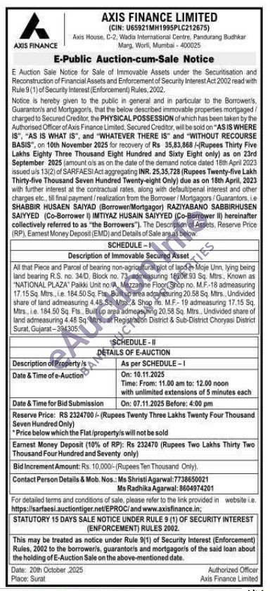 All that Piece and Parcel of bearing non-agricultural plot of land in Moje Unn, lying being land bearing R.S. no. 34/D, Block no. 73, admeasuring 16208.93 Sq. Mtrs, Known as "NATIONAL PLAZA Paikki Unit no. A. Mezzanine Floor, Shop no, M.F.-18 admeasuring 17.15 Sq. Mtrs, le 184.50 Sq. Fts., Built up area admeasuring 20.58 Sq. Mirs., Undivided share of land admeasuring 4.48 Sq. Mtrs., & Shop no. M.F-19 admeasuring 17.15 Sq. Mirs, ie. 184.50 Sq. Fts., Built up area admeasuring 20.58 Sq. Mtrs.. Undivided share of land admeasuring 4.48 Sq. Mtrs, at Registration District & Sub-District Choryasi District Surat, Gujarat-394305