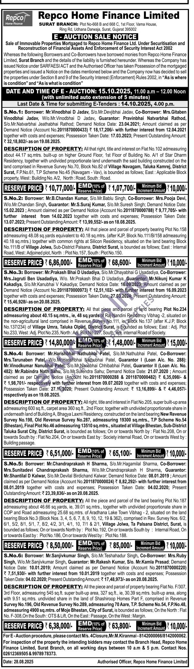 DESCRIPTION OF PROPERTY: All the piece and parcel of the land bearing Plot No.187 admeasuring about 46.66 sq.yards, ie, 39.01 sq.mtrs., together with undivided proportionate share in COP and Road admeasuring 25.68 sq.mtrs. of Aradhana Lake Town Vibhag 2, situated on the land bearing Block No.3 (Block Nos. 3, 4, 5, 6, 7, 8, 9, 10, 12, 19 & 362), comprised in Rev. Survey Nos. 6/2, 6/1, 5/2, 8/1, 5/1, 7, 8/2, 4/2, 3/1, 4/1, 10, 7/1 & 2/1, Village Jolwa, Ta Palsana District, Surat, is bounded as follows; On or towards North by: Plot No. 192, On or towards South by: Internal Road, On or towards East by: Plot No. 186, On or towards West by: Plot No.188.
