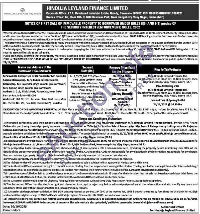 All That Piece and Parcel of Plot No. 101, Survey No. 29 and New No. 35, Sakhi Nagar, Indore, Total Plot Area 778 Sq. Ft., Boundaries of the said property are as follows: East-Other part of the same plot, West-Road, North-House No. 30, South-Other part of the same plot and wall.
