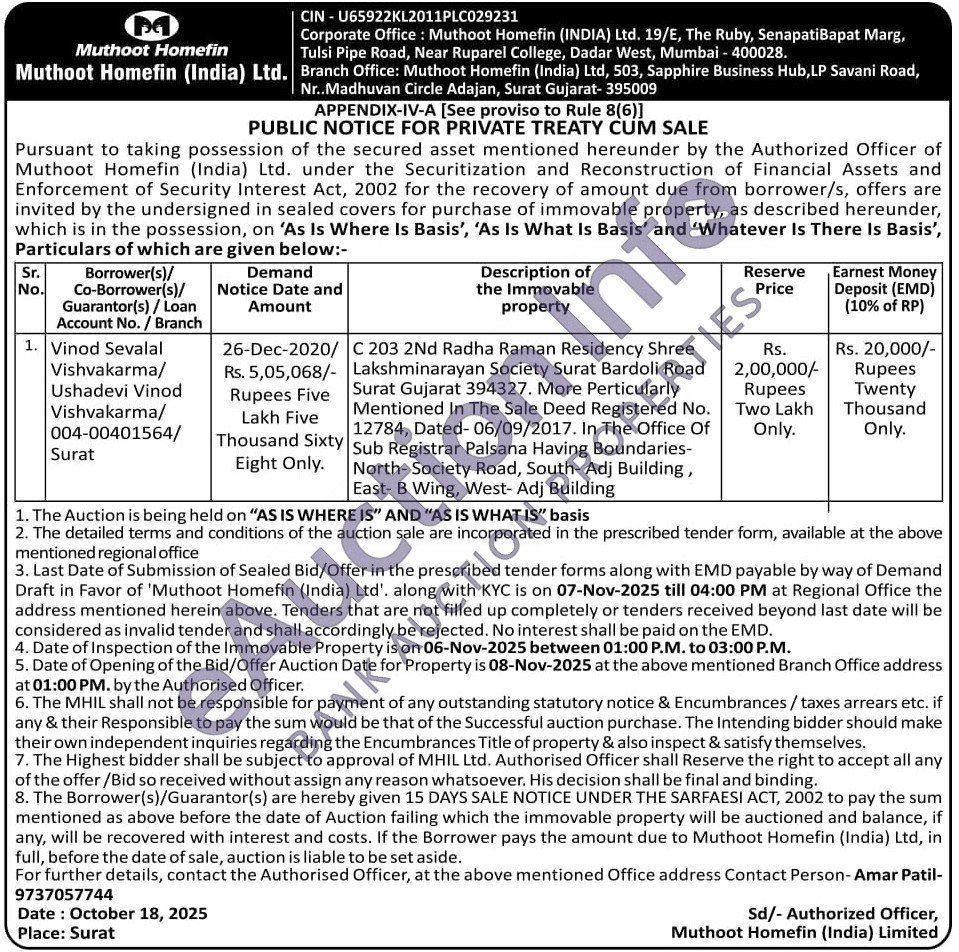 C 203 2Nd Radha Raman Residency Shree Lakshminarayan Society Surat Bardoli Road Surat Gujarat 394327. More Perticularly Mentioned In The Sale Deed Registered No. 12784, Dated-06/09/2017. In The Office Of Sub Registrar Palsana Having Boundaries-North- Society Road, South- Adj Building, East- B Wing, West- Adj Building