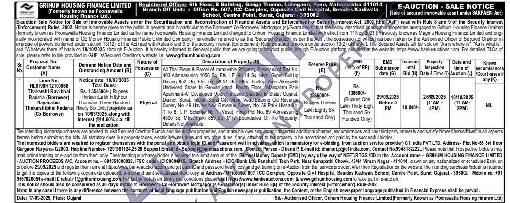 All That Piece & Parcel of immovable Property, Premises of Flat No. 403 Admeasuring 1056 Sq. Fts. I.E. 98.14 Sq. Mtrs. Super Builtup Having 952 Sq. Fts ie. 88.51 Sq. Mtrs. Builtup Area Alongwith Undivided Share In Ground Land, Fourth Floor, "Mangalam Park Apartment-A" Developed Upon Na Land Situated in State: Gujarat, Survey No. 49 Having New Revenue Survey No. Paiki Hissa No. District: Surat, Taluka: Surat City, Moje: Vesu Bearing Old Revenue 1 To 8, T. P. Scheme No. 1 (Vesu), Final Plot No. 89 Admeasuring 4300 Sq. Mtrs. Paiki 859 Sq. Mtrs. Boundaries Of The Property: Details Not Available