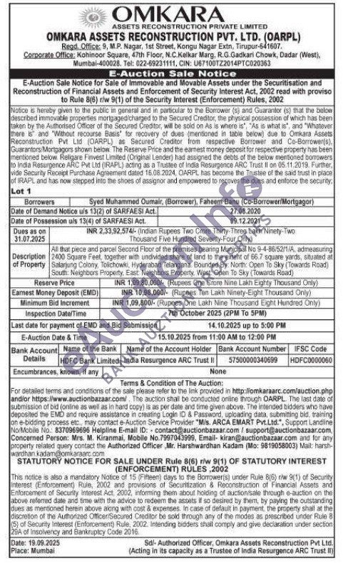 All that piece and parcel Second Floor of the premises bearing Municipal No 9-4-8615271/A, admeasuring 2400 Square Feet, together with undivided share of land to the extent of 66.7 square yards, situated at Salarjung Colony, Tolichowki, Hyderabad Telangana Bounded By: North: Open To Sky (Towards Road) South Neighbors Property, East Neighbors Property. West. Open To Sky (Towards Road)