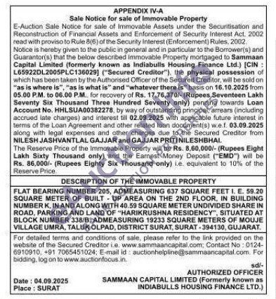 FLAT BEARING NUMBER 205, ADMEASURING 637 SQUARE FEET 1. E. 59.20 SQUARE METER OF BUILT-UP AREA ON THE 2ND FLOOR, IN BUILDING NUMBER K, IN AND ALONG WITH 40.59 SQUARE METER UNDIVIDED SHARE IN ROAD, PARKING AND LAND OF "HARIKRUSHNA RESIDENCY, SITUATED AT BLOCK NUMBER 338/B, ADMEASURING 19233 SQUARE METERS OF MOUJE VILLAGE UMRA, TALUK OLPAD, DISTRICT SURAT, SURAT-394130, GUJARAT