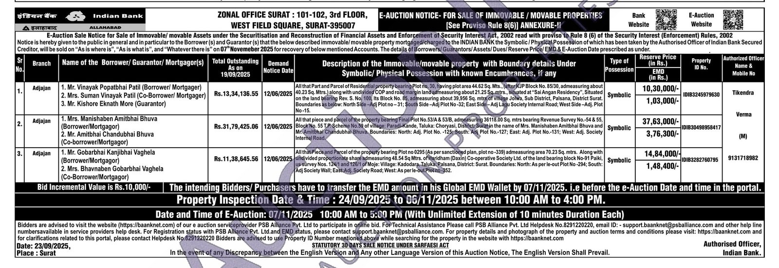 All that Part and Parcel of Residential property bearing Plot no. 30, having plot area 44.62 Sq. Mts., (after KJP Block No. 85/30, admeasuring about 25 40.23 Sq. Mtrs.) along with undivided COP and road margin land admeasuring about 21.25 Sq. mtrs., situated at "Sai Angan Residency", Situated on the land bearing Rev. S. No. 100, Its Block No. 85, admeasuring about 39,956 Sq. mtrs of village Jolwa, Sub District, Palsana, District Surat. Boundaries as below: North Side-Adj Plot no-31; South Side-Adj Plot No-32; East Side-Adj Lagu Society Internal Road; West Side-Adj. Plot No-15.