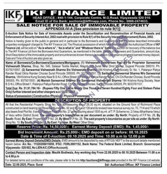 All that the Residential Property Shop No. G/9 admeasuring about 26.30 sq.mt situated on the Ground floor of Richmond Plaza constructed on land bearing old Revenue Survey No. 92 and 93/4 and 139 and its revised new revenue survey no. 70. 71/4 and 74 which also bears final Plot No. 9 and 27 paikee Final Plot No. 27 admeasuring about 1505 sq.mt. of T. P. Scheme no. 2 (Vesu-Bharthana-Vesu) of Vesu within District Surat. The said property's boundaries as per document as under: By North: Property of F.P No. 28, By South: Road, By East: Property of F.P No. 28, By West F.PNo. 26. The said property's boundaries as per site as under: By North: Shop No. 10, By South: Shop No. 8, By East: Passage, By West: Other Shop