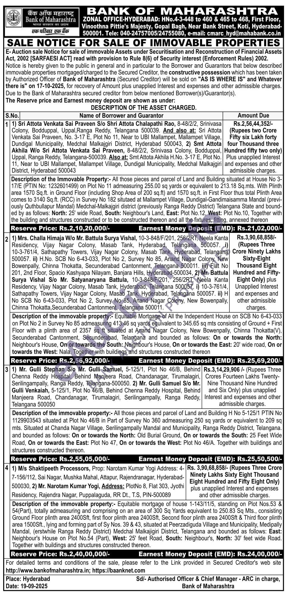 All those pieces and parcel of Land and Building H No 5-125/1 PTIN No 1129903543 situated at Plot No 46/8 in Part of Survey No 360 admeasuring 250 sq yards or equivalent to 209 sq mts. Situated at Chanda Nagar Village, Serilingampally Mandal and Municipality, Ranga Reddy District, Telangana. and bounded as follows: On or towards the North: Old Burial Ground, On or towards the South: 25 Feet Wide Road, On or towards the East: Plot No 47, On or towards the West: Plot No 46/A. Together with buildings and structures constructed thereon.